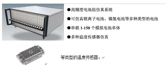 測試係統核心基於高精度可編程電池單體模擬器,可以通過程序精確模擬鋰離子電池,鎳氫電池等多種電池的充電和放電過程,設定並仿真電池組 SOC。並可根據實際需要配置電池單體模擬器的數目。係統中還配置有高精度可編程溫度傳感器仿真器,可以用於仿真 NTC、PTC、PT100/PT1000